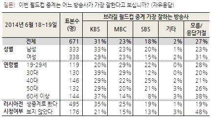 À̹ø ºê¶óÁú ¿ùµåÄÅ ±â°£ Áß¿¡´Â ÀÌ¿µÇ¥(KBS), ¼ÛÁ¾±¹°ú ¾ÈÁ¤È¯(MBC), Â÷¹ü±Ù°ú Â÷µÎ¸®(SBS)°¡ °¢ ¹æ¼Û»çÀÇ °£ÆÇ±Þ ÇØ¼³À§¿øÀ¸·Î ³ª¼ Á¦°¢±â ´Ù¸¥ °³¼ºÀ» º¸¿©ÁÖ°í ÀÖ´Ù. °³¸·ÀϺÎÅÍ Çѱ¹ ´ëÇ¥ÆÀ ù °æ±â¿¡ À̸£±â±îÁö À̹ø ¿ùµåÄÅ Áß°è´Â ¾î´À ¹æ¼Û»ç°¡ °¡Àå ÀßÇÑ´Ù°í º¸´ÂÁö ¹°Àº °á°ú 31%°¡ KBS¸¦, 23%´Â MBC¸¦, 18%´Â SBS¸¦ ²Å¾ÒÀ¸¸ç 2%´Â ±âŸ, ±×¸®°í 27%´Â ÀǰßÀ» À¯º¸Çß´Ù.