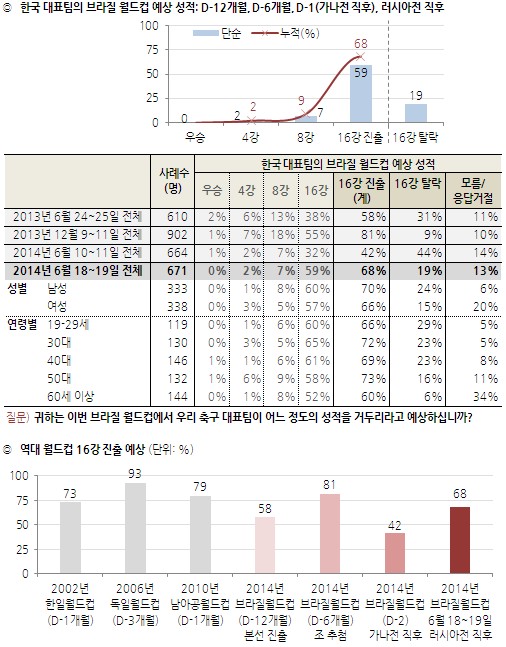 ¡Ý ÀÛ³â 6¿ù Á¶»ç¿¡¼´Â ºê¶óÁú ¿ùµåÄÅ º»¼± ÁøÃâÀ» Èû°ã°Ô È®Á¤ÇÑ Å¿¿¡ 16° ÁøÃâ ¿¹»óÀÌ 58%·Î ³·Àº ÆíÀÌÀ¸³ª, ÀÛ³â 12¿ù(Á¶ Ãß÷ Á÷ÈÄ) Á¶»ç¿¡¼´Â ±× ºñÀ²ÀÌ 81%±îÁö ´Ã¾ú´Ù. Áö³ ¹ø Á¶»ç¿¡¼´Â ¸¶Áö¸· Æò°¡Àü ¿ÏÆÐ(6¿ù 10ÀÏ ¿ÀÀü, °¡³ª:Çѱ¹=4:0) ¿µÇâÀ¸·Î ¿ª´ë ¿ùµåÄÅ Àü¸Á Áß °¡Àå ºñ°üÀûÀÎ ±â·ÏÀ» ³²°åÁö¸¸(16° ÁøÃâ 42%, Å»¶ô 44%) ·¯½Ã¾ÆÀüÀÌ ¿ì¸® ±¹¹ÎµéÀÇ ±â´ë°¨À» ´Ù½Ã ²ø¾î¿Ã¸° ¼ÀÀÌ´Ù.