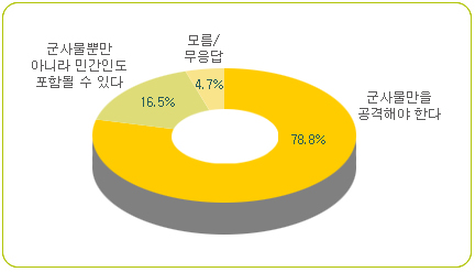 ±º»ç°ø°Ý½Ã ''±º»ç¹°¸¸ °ø°ÝÇØ¾ß'' 78.8% ¹Ì±¹ÀÌ ±º»çÀû °ø°ÝÀ» °¨ÇàÇÒ °æ¿ì ±× °ø°Ý ´ë»ó¹üÀ§¿¡ ´ëÇØ¼´Â ÀÀ´äÀÚÀÇ 78.8%°¡ ''±º»ç¹°¸¸À» °ø°ÝÇØ¾ß ÇÑ´Ù''°í ÀÀ´äÇØ ¿ì¸® ±¹¹Î ´ëºÎºÐÀÌ ¹Ì±¹ÀÇ ±º»ç°ø°ÝÀ¸·Î °ø°Ý´ë»ó±¹°¡ÀÇ ¹«°íÇÑ ¹Î°£ÀÎÀÌ Èñ»ýµÇ¾î¼´Â ¾ÈµÈ´Ù°í »ý°¢Çϰí ÀÖ´Â °ÍÀ¸·Î ³ªÅ¸³µ´Ù. ÀÌ¿Í °°Àº ÀǰßÀº ƯÈ÷ 2,30´ë ¿¬·ÉÃþ(°¢°¢ 83.7%, 83.9%), ´ëÀçÀÌ»ó °íÇзÂÃþ(84.8%), ´ëÇлý(86.0%), ±×¸®°í ÈÀÌÆ®Ä®¶ó°èÃþ(84.8%)¿¡¼ ³ô¾Ò´Ù. ÇÑÆí ''±º»ç¹°»Ó¸¸ ¾Æ´Ï¶ó ¹Î°£Àεµ Æ÷Ç﵃ ¼ö ÀÖ´Ù''´Â ÀÀ´äµµ 16.5%³ª µÇ¾ú°í, ÀÌ·¯ÇÑ ÀÀ´äÀº 50¼¼ ÀÌ»ó °í¿¬·ÉÃþ(21.8%)°ú ÁßÁ¹ÀÌÇÏ ÇзÂÃþ(23.5%)¿¡¼ »ó´ëÀûÀ¸·Î ³ô°Ô ³ªÅ¸³µ´Ù. < ¹Ì Á¤ºÎÀÇ ±º»ç°ø°Ý ´ë»ó¹üÀ§ >