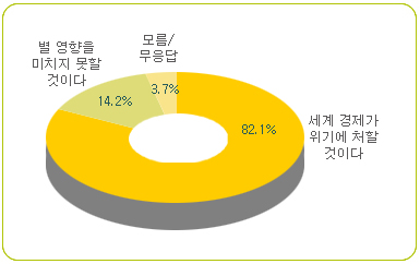 ÀÀ´äÀÚ 10¸í Áß 8¸íÀº ''¼¼°è °æÁ¦ À§±â °¡´É¼º'' ¿ì·Á ¹Ì±¹¿¡¼ ¹ß»ýÇÑ Å×·¯·Î ¼¼°è °æÁ¦°¡ À§±â¿¡ óÇÒ °ÍÀ̶ó°í »ý°¢ÇÏ´ÂÁö Áú¹®ÇÑ °á°ú, ÀÀ´äÀÚÀÇ 82.1%°¡ ''±×·¸´Ù''°í ÀÀ´äÇßÀ¸¸ç, ''º° ¿µÇâÀ» ¹ÌÄ¡Áö ¸øÇÒ °ÍÀÌ´Ù''´Â 14.2%¿´´Ù. À̹ø »çÅ·Π¼¼°è°æÁ¦°¡ À§±â¿¡ óÇÒ °ÍÀ̶ó´Â ¿ì·Á´Â Àü°èÃþ¿¡¼ ''º° ¿µÇâÀ» ¹ÌÄ¡Áö ¸øÇÒ °Í''À̶ó´Â ¿¹»óº¸´Ù ¸¹Àº °¡¿îµ¥ ƯÈ÷ ¿©ÀÚ(86.1%), 30´ë ¿¬·ÉÃþ(84.1%), ÀÚ¿µ¾÷(85.9%)°ú °¡Á¤ÁÖºÎÃþ(85.5%)¿¡¼ ³ô¾Ò´Ù < ÇâÈÄ ¼¼°è°æÁ¦ À§±â °¡´É¼º >