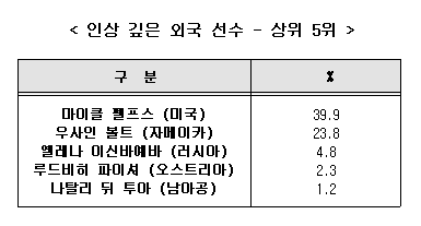 Àλó ±íÀº ¼±¼ö 2À§´Â À°»ó ½Å±â·ÏÀÇ »ç³ªÀÌ ÀÚ¸ÞÀÌÄ«ÀÇ ¿ì»çÀÎ º¼Æ®(23.8%)°¡ Â÷ÁöÇßÀ¸¸ç º£ÀÌ¡¿¡¼ 24¹øÂ° ¼¼°è ½Å±â·ÏÀ» ÀÛ¼ºÇÑ ¹Ì³à»õ À̽Źٿ¹¹Ù°¡ 4.8%·Î 3À§¿¡ ¿Ã¶ú´Ù. 4À§´Â À¯µµ °á½ÂÀü¿¡¼ ÃÖ¹ÎÈ£¿¡°Ô ÇÑÆÇÀ¸·Î ÆÐÇÑ µÚ ÃÖ¹ÎÈ£¸¦ °Ý·ÁÇÑ ¸Å³Ê³²·çµåºñÈ÷ ÆÄÀ̼Å(2.3%)°¡ ²ÅÇû´Ù. Àΰ£½Â¸®ÀÇ °¨µ¿À» º¸¿©ÁØ ³²¾ÆÇÁ¸®Ä« °øÈ±¹ÀÇ ÀÇÁ· ¼ö¿µ¼±¼ö ³ªÅ»¸® µÚ Åõ¾Æ(1.2%)´Â 5À§¸¦ Â÷ÁöÇß´Ù.