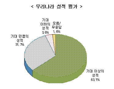 º£ÀÌ¡ ¿Ã¸²ÇÈ¿¡¼ °ÅµÐ ¿ì¸®³ª¶ó ¼±¼ö´ÜÀÇ ¼ºÀûÀ» ¾î¶»°Ô Æò°¡ÇÏ´ÂÁö ¹°¾îº» °á°ú, ±¹¹ÎÀÇ 63.1%°¡ ±â´ë ÀÌ»óÀÇ ¼ºÀûÀ» ¿Ã·È´Ù°í ÀÀ´äÇßÀ¸¸ç ±â´ë ¸¸ÅÀÇ ¼ºÀûÀ» ¿Ã·È´Ù´Â ÀÀ´äµµ 31.7%¿´´Ù. ¹Ý¸é ¡®±â´ë ÀÌÇÏÀÇ ¼ºÀû¡¯À̶ó´Â ÀÀ´äÀº 3.6%·Î Àû¾î, ´ë´Ù¼öÀÇ ±¹¹ÎµéÀº ´ëÇѹα¹ ¼±¼ö´ÜÀÇ º£ÀÌ¡ ¿Ã¸²ÇÈ ¼ºÀû¿¡ ¸¸Á·ÇÏ´Â °ÍÀ¸·Î ³ªÅ¸³µ´Ù.