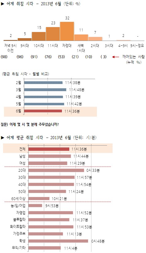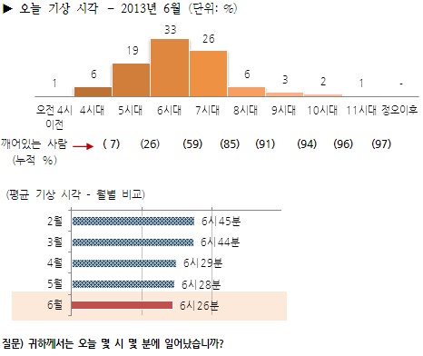 2013³â 6¿ù, ¾ÆÄ§ 6½Ã¸é ³× ¸í Áß ÇÑ ¸í(26%: 5½Ã´ë ´©Àû ºñÀ²)ÀÌ ±ú¾î³ª°í, 7½Ã Á¤°¢ÀÌ¸é ¿ ¸í Áß ¿©¼¸ ¸í(59%), 9½Ã Á¤°¢ÀÌ µÇ¸é 90% ÀÌ»ó ´ëºÎºÐÀÌ ÀϾ´Ù.