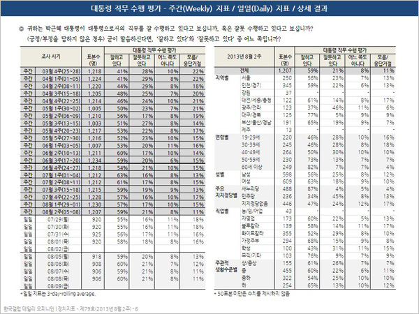 Çѱ¹°¶·´ÀÌ 8¿ù 2ÁÖ(8/5~8) Àü±¹ ¼ºÀÎ 1,207¸í¿¡°Ô ¹Ú±ÙÇý ´ëÅë·ÉÀÌ ´ëÅë·ÉÀ¸·Î¼ÀÇ Á÷¹«¸¦ Àß ¼öÇàÇϰí ÀÖ´Ù°í º¸´ÂÁö, À߸ø ¼öÇàÇϰí ÀÖ´Ù°í º¸´ÂÁö Áú¹®ÇÑ °á°ú, 59%´Â ±àÁ¤ Æò°¡Çß°í 21%´Â ºÎÁ¤ Æò°¡ÇßÀ¸¸ç 19%´Â ÀǰßÀ» À¯º¸Çß´Ù(¾î´À Âʵµ ¾Æ´Ô 8%, ¸ð¸§/ÀÀ´ä°ÅÀý 11%).
