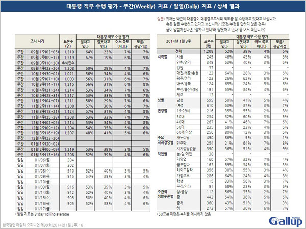 Çѱ¹°¶·´ÀÌ 2014³â 1¿ù ¼Â° ÁÖ(13ÀϺÎÅÍ 16ÀϱîÁö ³ªÈê°£) Àü±¹ ¼ºÀÎ 1,208¸í¿¡°Ô ¹Ú±ÙÇý ´ëÅë·ÉÀÌ ´ëÅë·ÉÀ¸·Î¼ÀÇ Á÷¹«¸¦ Àß ¼öÇàÇϰí ÀÖ´Ù°í º¸´ÂÁö, À߸ø ¼öÇàÇϰí ÀÖ´Ù°í º¸´ÂÁö Áú¹®ÇÑ °á°ú, 52%´Â ±àÁ¤ Æò°¡Çß°í 39%´Â ºÎÁ¤ Æò°¡ÇßÀ¸¸ç 10%´Â ÀǰßÀ» À¯º¸Çß´Ù(¾î´À Âʵµ ¾Æ´Ô 4%, ¸ð¸§/ÀÀ´ä°ÅÀý 6%).