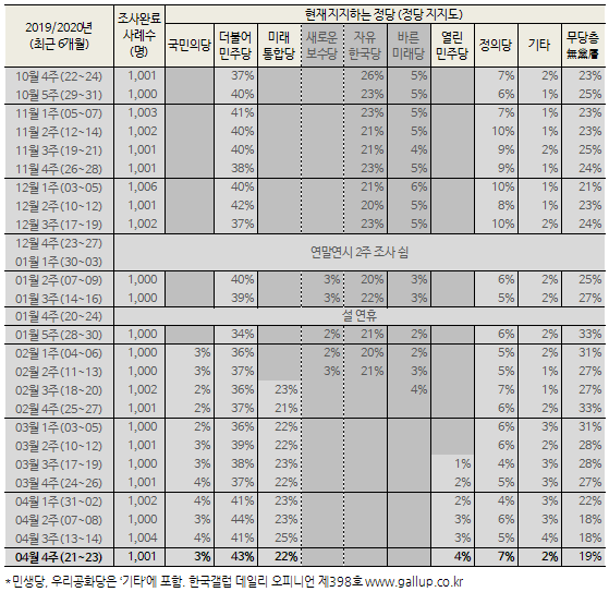 2020³â 4¿ù ³Ý° ÁÖ(21~23ÀÏ) ÇöÀç ÁöÁöÇÏ´Â Á¤´çÀº ´õºÒ¾î¹ÎÁÖ´ç 43%, ¹Ì·¡ÅëÇÕ´ç 22%, ÁöÁöÁ¤´çÀÌ ¾ø´Â ¹«´ç(ÙíÓÚ)Ãþ 19%, Á¤ÀÇ´ç 7%, ¿¸°¹ÎÁÖ´ç 4%, ±¹¹ÎÀÇ´ç 3% ¼øÀÌ¸ç ±× ¿Ü Á¤´çµéÀÇ ÇÕÀÌ 2%´Ù. Áö³ÁÖ¿Í ºñ±³ÇÏ¸é ´õºÒ¾î¹ÎÁÖ´ç·Á¤ÀÇ´ç ÁöÁöµµ°¡ °¢°¢ 2%Æ÷ÀÎÆ®, ¿¸°¹ÎÁÖ´çÀº 1%Æ÷ÀÎÆ® »ó½ÂÇßÀ¸¸ç ¹Ì·¡ÅëÇÕ´ç·±¹¹ÎÀÇ´çÀº °¢°¢ 3%Æ÷ÀÎÆ®·1Æ÷ÀÎÆ® Ç϶ôÇß´Ù.