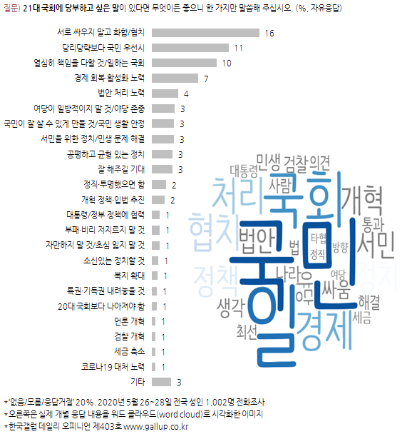 À¯±ÇÀÚ°¡ 21´ë ±¹È¸¿¡ ´çºÎÇÏ°í ½ÍÀº ¸»·Î´Â(ÀÚÀ¯ÀÀ´ä) '¼·Î ½Î¿ìÁö ¸»°í ÈÇÕ/ÇùÄ¡'(16%)°¡ °¡Àå ¸¹¾ÒÀ¸¸ç, ±×´ÙÀ½Àº '´ç¸®´ç·«º¸´Ù ±¹¹Î ¿ì¼±½Ã'(11%), '¿½ÉÈ÷ Ã¥ÀÓÀ» ´ÙÇÒ °Í/ÀÏÇÏ´Â ±¹È¸'(10%), '°æÁ¦ ȸº¹·È°¼ºÈ ³ë·Â'(7%), '¹ý¾È ó¸® ³ë·Â'(4%), '¿©´çÀÌ ÀϹæÀûÀÌÁö ¸» °Í/¾ß´ç Á¸Áß', '±¹¹ÎÀÌ Àß »ì ¼ö ÀÖ°Ô ¸¸µé °Í/±¹¹Î »ýȰ ¾ÈÁ¤', '¼¹ÎÀ» À§ÇÑ Á¤Ä¡/¹Î»ý ¹®Á¦ ÇØ°á', '°øÆòÇÏ°í ±ÕÇü ÀÖ´Â Á¤Ä¡', 'Àß ÇØÁÖ±æ ±â´ë'(ÀÌ»ó 3%) ¼øÀÌ´Ù.