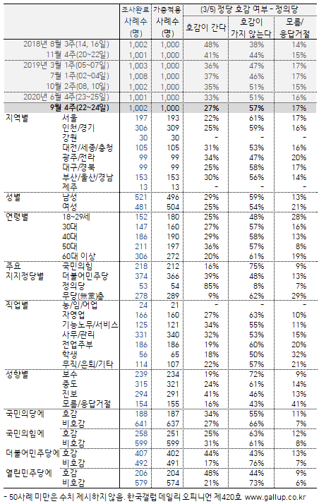 ¡Ý Áö³ 2³â°£ Àϰö Â÷·Ê Á¶»ç¿¡¼ ´õºÒ¾î¹ÎÁÖ´ç È£°¨µµ ÃÖ°íÄ¡´Â 2018³â 8¿ù 57%(→ µ¥Àϸ® Á¦319È£, Æò¾ç ³²ºÏÁ¤»óȸ´ã ÇÕÀÇ ÁîÀ½), À̹ø 2020³â 9¿ù 40%°¡ ÃÖÀúÄ¡´Ù. Á¤ÀÇ´ç È£°¨µµ´Â 2018³â 8¿ù 48%¿¡¼ À̹ø 27%±îÁö Áö¼ÓÀûÀ¸·Î Ç϶ôÇß´Ù. ±¹¹ÎÀÇÈû È£°¨µµ´Â Àü½Å ÀÚÀ¯Çѱ¹´ç ±âÁØ 2018³â 8¿ù·11¿ù 15%°¡ ÃÖÀúÄ¡, 2019³â 10¿ù 28%°¡ ÃÖ°íÄ¡´Ù(→ µ¥Àϸ® Á¦373È£, Á¶±¹ Àü ¹ý¹«ºÎÀå°ü °ËÂû°³Çõ ¹æ¾È ¹ßÇ¥ ÁîÀ½).