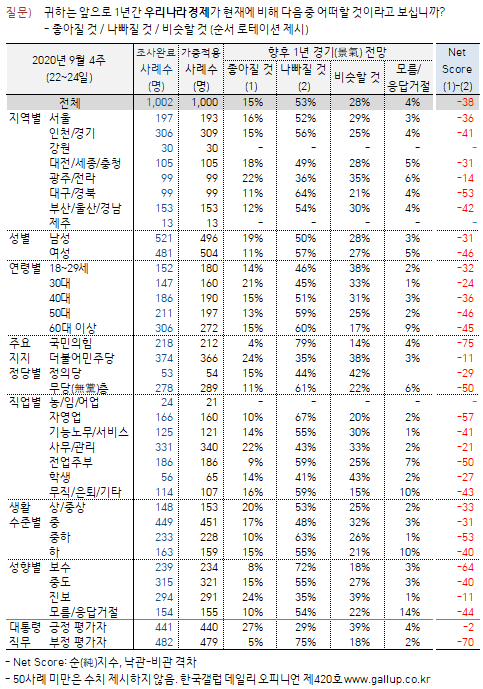 Çѱ¹°¶·´ÀÌ 2020³â 9¿ù 22~24ÀÏ Àü±¹ ¸¸ 18¼¼ ÀÌ»ó 1,002¸í¿¡°Ô ÇâÈÄ 1³â ¿ì¸®³ª¶ó °æ±â Àü¸ÁÀ» ¹°Àº °á°ú 15%°¡ 'ÁÁ¾ÆÁú °Í', 53%´Â '³ªºüÁú °Í', 28%´Â 'ºñ½ÁÇÒ °Í'À̶ó°í ´äÇß°í 4%´Â ÀǰßÀ» À¯º¸Çß´Ù. ³«°ü Àü¸ÁÀº Áö³´Þº¸´Ù 5%Æ÷ÀÎÆ® ´Ã¾ú°í, ºñ°ü Àü¸ÁÀº 11%Æ÷ÀÎÆ® ÁÙ¾ú´Ù. 28°³¿ù ¿¬¼Ó ºñ°üÀÌ ³«°üÀ» ¾Õ¼Áö¸¸, ±× °ÝÂ÷´Â Áö³´Þº¸´Ù °¨¼ÒÇß´Ù.