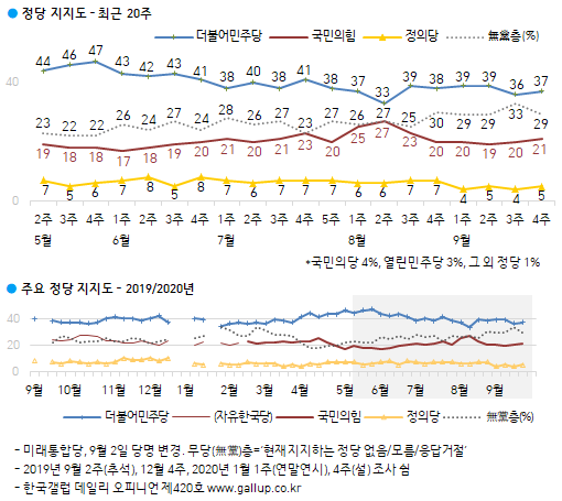 2020³â 9¿ù ³Ý° ÁÖ(22~24ÀÏ) ÇöÀç ÁöÁöÇÏ´Â Á¤´çÀº ´õºÒ¾î¹ÎÁÖ´ç 37%, ÁöÁöÁ¤´çÀÌ ¾ø´Â ¹«´ç(ÙíÓÚ)Ãþ 29%, ±¹¹ÎÀÇÈû 21%, Á¤ÀÇ´ç 5%, ±¹¹ÎÀÇ´ç 4%, ¿¸°¹ÎÁÖ´ç 3% ¼øÀÌ¸ç ±× ¿Ü Á¤´çµéÀÇ ÇÕÀÌ 1%´Ù. Áö³ÁÖ¿Í ºñ±³ÇÏ¸é ´õºÒ¾î¹ÎÁÖ´ç·±¹¹ÎÀÇÈû·Á¤ÀÇ´ç·±¹¹ÎÀÇ´ç ÁöÁöµµ°¡ °¢°¢ 1%Æ÷ÀÎÆ® »ó½ÂÇß°í, ¹«´çÃþÀÌ 4%Æ÷ÀÎÆ® ÁÙ¾ú´Ù. ¿¸°¹ÎÁÖ´çÀº º¯ÇÔ¾ø¾ú´Ù.