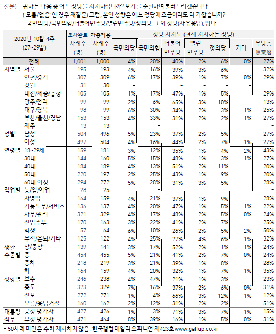 2020³â 10¿ù ³Ý° ÁÖ(27~29ÀÏ) ÇöÀç ÁöÁöÇÏ´Â Á¤´çÀº ´õºÒ¾î¹ÎÁÖ´ç 40%, ÁöÁöÁ¤´çÀÌ ¾ø´Â ¹«´ç(ÙíÓÚ)Ãþ 27%, ±¹¹ÎÀÇÈû 20%, Á¤ÀÇ´ç 6%, ±¹¹ÎÀÇ´ç 4%, ¿¸°¹ÎÁÖ´ç 2% ¼øÀÌ´Ù. Áö³ÁÖ¿Í ºñ±³ÇÏ¸é ´õºÒ¾î¹ÎÁÖ´ç°ú ±¹¹ÎÀÇÈû ÁöÁöµµ°¡ °¢°¢ 5%Æ÷ÀÎÆ®, 3%Æ÷ÀÎÆ® »ó½ÂÇß°í ¹«´çÃþÀº 7%Æ÷ÀÎÆ® ÁÙ¾ú´Ù.