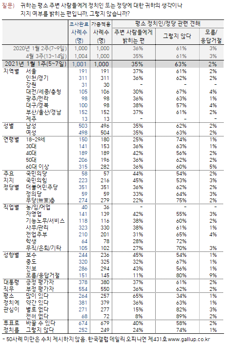 Æò¼Ò ÁÖº¯ »ç¶÷µé¿¡°Ô Á¤Ä¡ÀηÁ¤´ç¿¡ ´ëÇÑ Àڱ⠻ý°¢À̳ª ÁöÁö ¿©ºÎ¸¦ ¹àÈ÷´Â ÆíÀÎÁö ¹°Àº °á°ú '¹àÈ÷´Â Æí' 35%, '±×·¸Áö ¾Ê´Ù' 63%·Î ³ªÅ¸³µÀ¸¸ç 2%´Â ÀǰßÀ» À¯º¸Çß´Ù. ÀÌ´Â 1³â ÀüÀÎ 2020³â 1¿ù°ú ÃѼ± Á÷ÀüÀÎ 4¿ù°ú ´ëµ¿¼ÒÀÌÇÑ °á°ú´Ù. Áï, ¼±°Å°¡ ÀÓ¹ÚÇÑ »óȲÀÌµç ¾Æ´Ïµç Æò¼Ò ÀÚ½ÅÀÇ Á¤Ä¡Àû °ßÇØ¸¦ µå·¯³»´Â »ç¶÷Àº ¼¼ ¸í Áß ÇÑ ¸í Á¤µµ¶ó°í º¼ ¼ö ÀÖ´Ù.