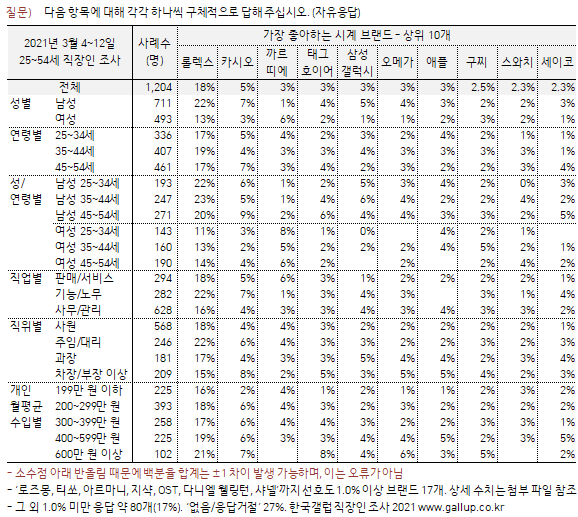Çѱ¹°¶·´ÀÌ 2021³â 3¿ù 4~12ÀÏ Àü±¹ ¸¸ 25~54¼¼ Á÷ÀåÀÎ 1,204¸í¿¡°Ô °¡Àå ÁÁ¾ÆÇÏ´Â ½Ã°è ºê·£µå¸¦ ¹°Àº °á°ú(ÀÚÀ¯ÀÀ´ä), '·Ñ·º½º'(18%), 'Ä«½Ã¿À'(5%), '±î¸£¶ì¿¡', 'ű×È£À̾î', '»ï¼º °¶·°½Ã', '¿À¸Þ°¡', '¾ÖÇÃ'(ÀÌ»ó 3%), '±¸Âî'(2.5%), '½º¿ÍÄ¡', '¼¼ÀÌÄÚ'(ÀÌ»ó 2.3%)°¡ »óÀ§ 10°³ ¾È¿¡ µé¾ú´Ù. ±× ¿Ü 1.0% ÀÌ»ó ÀÀ´äµÈ ½Ã°è ºê·£µå´Â '·ÎÁî¸ù', 'Ƽ½î'(ÀÌ»ó 2.1%), '¾Æ¸£¸¶´Ï'(1.7%), 'Áö¼¡'(1.4%), 'OST', '´Ù´Ï¿¤ À£¸µÅÏ'(ÀÌ»ó 1.1%), '»þ³Ú'(1.0%) µîÀÌ´Ù.