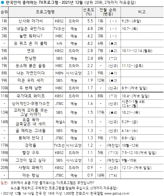 - 2021³â 12¿ù Çѱ¹ÀÎÀÌ ÁÁ¾ÆÇÏ´Â TVÇÁ·Î±×·¥ 1À§: ¡´½Å»ç¿Í ¾Æ°¡¾¾¡µ(KBS2) 5.5%