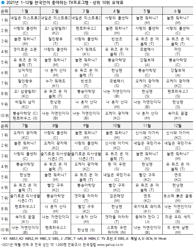 2021³â ¸Å¿ù Á¶»ç¿¡¼ 1À§¸¦ Â÷ÁöÇÑ ÇÁ·Î±×·¥Àº ¡´¹Ì½ºÆ®·Ô2¡µ(TVÁ¶¼±, 1~3¿ù), ¡´»ç¶ûÀÇ Äݼ¾Å¸¡µ(TVÁ¶¼±, 4¿ù, 8¿ù), ¡´³î¸é ¹¹ÇÏ´Ï?¡µ(MBC, 5~6¿ù, 9~10¿ù), ¡´¿ÀÄÉÀÌ ±¤Àڸšµ(KBS2, 7¿ù), ¡´½Å»ç¿Í ¾Æ°¡¾¾¡µ(KBS2, 11~12¿ù)±îÁö ´Ù¼¸ ÆíÀÌ´Ù. ±× ¿Ü µå¶ó¸¶ ¡´¿À! »ï±¤ºô¶ó!¡µ(KBS2), ¡´ÆæÆ®ÇϿ콺2¡µ(SBS), ¡´Ã¶ÀοÕÈÄ¡µ ¡´ºó¼¾Á¶¡µ ¡´½½±â·Î¿î ÀÇ»ç»ýȰ ½ÃÁð2¡µ(ÀÌ»ó tvN), ¿¹´É Áß¿¡¼´Â ¡´À¯ ÄûÁî ¿Â ´õ ºí·°¡µ(tvN), ¡´±¹¹Î°¡¼ö¡µ(TVÁ¶¼±)°¡ 2~3À§±îÁö ¿Ã¶ú´Ù.