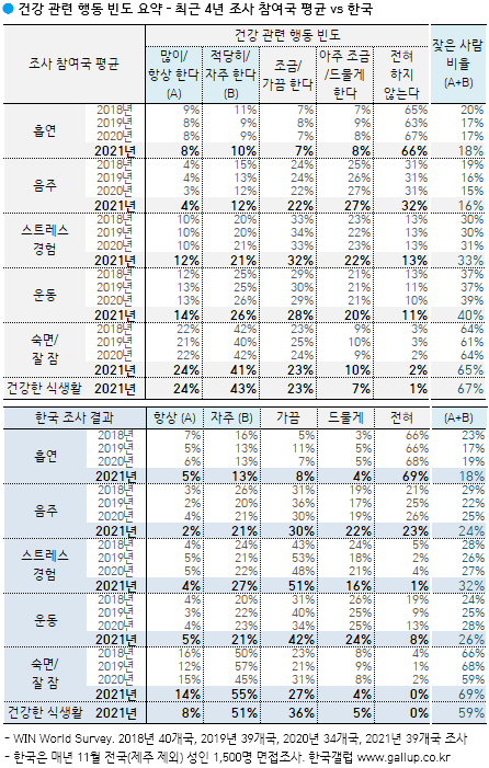 ´ÙÀ½À¸·Î, °Ç°¿¡ ÁÁÀº Çൿ ¼¼ °¡Áö(¼÷¸é, ¿îµ¿, °Ç°ÇÑ ½Ä»ýȰ)¿Í °Ç°¿¡ ÁÁÁö ¾ÊÀº Çൿ ¼¼ °¡Áö(Èí¿¬, À½ÁÖ, ½ºÆ®·¹½º) °¢°¢¿¡ ´ëÇÑ ºóµµ¸¦ ¹°¾ú´Ù. ±× °á°ú 39°³±¹ ¼ºÀÎ Áß 67%°¡ 'Æò¼Ò °Ç°ÇÏ°Ô ¸Ô´Â´Ù'(ÀÌÇÏ 5Á¡ ôµµ Áß 'Ç×»ó+ÀÚÁÖ ÇÑ´Ù' ÀÀ´ä ±âÁØ), 65%°¡ 'ÀáÀ» Àß ÀÜ´Ù', 40%´Â '±ÔÄ¢ÀûÀ¸·Î ¿îµ¿ÇÑ´Ù'°í ´äÇß´Ù. 33%´Â Àϻ󿡼 ½ºÆ®·¹½º¿¡ ½Ã´Þ¸®°í, Èí¿¬°ú À½ÁÖ°¡ ÀæÀº »ç¶÷Àº °¢°¢ 18%, 16%¿´´Ù.