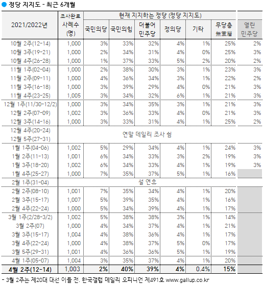 2022³â 4¿ù µÑ° ÁÖ(12~14ÀÏ) ÇöÀç ÁöÁöÇÏ´Â Á¤´çÀº ±¹¹ÎÀÇÈû 40%, ´õºÒ¾î¹ÎÁÖ´ç 39%, ÁöÁöÇÏ´Â Á¤´ç ¾ø´Â ¹«´ç(ÙíÓÚ)Ãþ 15%, Á¤ÀÇ´ç 4%, ±¹¹ÎÀÇ´ç 2% ¼øÀÌ´Ù. ¿¬·Éº°·Î º¸¸é 60´ë À̻󿡼´Â ±¹¹ÎÀÇÈû, 40´ë¿¡¼´Â ´õºÒ¾î¹ÎÁÖ´ç ÁöÁöµµ°¡ 50%´ë Áß¹ÝÀÌ´Ù. Á¤Ä¡ °í°ü½ÉÃþ¿¡¼´Â ±¹¹ÎÀÇÈû 50%, ´õºÒ¾î¹ÎÁÖ´ç 41%, ¹«´çÃþ 6%´Ù. À̹ø ÁÖ ¾ç´ë Á¤´ç ÁöÁöµµ µ¿¹Ý »ó½ÂÀº Áö¹æ¼±°Å Á¤´ç °øÃµ º»°ÝÈ ¿µÇâÀ¸·Î º¸ÀδÙ.