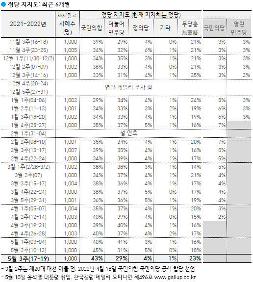 2022³â 5¿ù ¼Â° ÁÖ(17~19ÀÏ) ÇöÀç ÁöÁöÇÏ´Â Á¤´çÀº ±¹¹ÎÀÇÈû 43%, ´õºÒ¾î¹ÎÁÖ´ç 29%, ÁöÁöÇÏ´Â Á¤´ç ¾ø´Â ¹«´ç(ÙíÓÚ)Ãþ 23%, Á¤ÀÇ´ç 4%, ±× ¿Ü Á¤´ç/´Üü 1%´Ù. 3¿ù ´ëÅë·É¼±°Å Á÷ÀüºÎÅÍ 5¿ù ù° ÁÖ±îÁö ¾ç´ç ÁöÁöµµ°¡ ºñµîÇßÀ¸³ª, Áö³ÁÖ À±¼®¿ ´ëÅë·É ÃëÀÓ°ú ÇÔ²² ±¹¹ÎÀÇÈûÀº »ó½ÂÇÏ°í ´õºÒ¾î¹ÎÁÖ´çÀº Ç϶ôÇØ °ÝÂ÷°¡ Ä¿Á³´Ù.