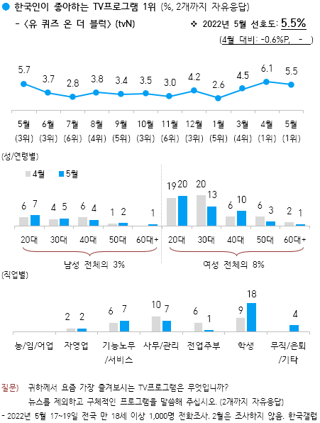 Çѱ¹°¶·´ÀÌ 2022³â 5¿ù 17~19ÀÏ Àü±¹ ¸¸ 18¼¼ ÀÌ»ó 1,000¸í¿¡°Ô ¿äÁò °¡Àå Áñ°Üº¸´Â TVÇÁ·Î±×·¥À» ¹°Àº °á°ú(2°³±îÁö ÀÚÀ¯ÀÀ´ä), tvNÀÇ ¼ö¿äÀÏ Àú³á ¿¹´É ¡´À¯ ÄûÁî ¿Â ´õ ºí·°¡µÀÌ ¼±È£µµ 5.5%·Î µÎ ´Þ ¿¬¼Ó 1À§¸¦ Â÷ÁöÇß´Ù.
