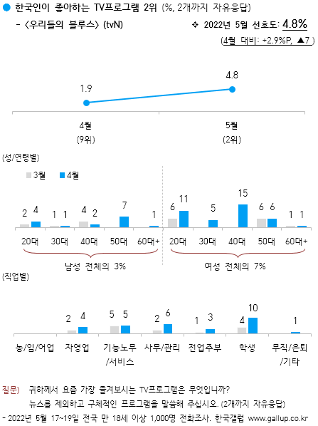 2022³â 5¿ù Çѱ¹ÀÎÀÌ ÁÁ¾ÆÇÏ´Â TVÇÁ·Î±×·¥ 2À§: ¡´¿ì¸®µéÀÇ ºí·ç½º¡µ(tvN) 4.8%