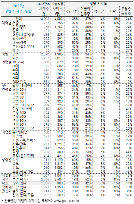 2022³â 8¿ù ³Ý° ÁÖ(23~25ÀÏ) ÇöÀç ÁöÁöÇÏ´Â Á¤´çÀº ´õºÒ¾î¹ÎÁÖ´ç 36%, ±¹¹ÎÀÇÈû 35%, ÁöÁöÇÏ´Â Á¤´ç ¾ø´Â ¹«´ç(ÙíÓÚ)Ãþ 24%, Á¤ÀÇ´ç 4%´Ù. ¿¬·Éº°·Î º¸¸é 60´ë À̻󿡼´Â ±¹¹ÎÀÇÈû, 40´ë¿¡¼´Â ´õºÒ¾î¹ÎÁÖ´ç ÁöÁöµµ°¡ 50%´ë´Ù. 20·30´ë ¿ ¸í Áß ¼³ÓÀº ¹«´çÃþÀÌ´Ù.