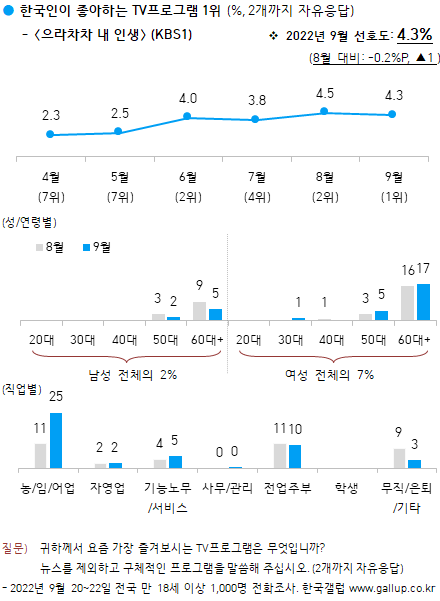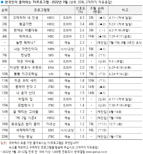Çѱ¹°¶·´ÀÌ 2022³â 9¿ù 20~22ÀÏ Àü±¹ ¸¸ 18¼¼ ÀÌ»ó 1,000¸í¿¡°Ô ¿äÁò °¡Àå Áñ°Üº¸´Â TVÇÁ·Î±×·¥À» ¹°Àº °á°ú(2°³±îÁö ÀÚÀ¯ÀÀ´ä), KBS1 Àú³á ÀÏÀÏ µå¶ó¸¶ ¡´À¸¶óÂ÷Â÷ ³» Àλý¡µÀÌ ¼±È£µµ 4.3%·Î 1À§¸¦ Â÷ÁöÇß´Ù.