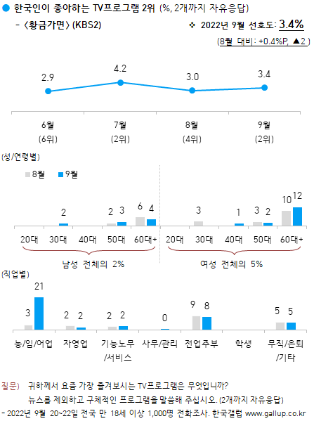 2022³â 9¿ù ÁÁ¾ÆÇÏ´Â TVÇÁ·Î±×·¥ 2À§: Àú³á ÀÏÀ챯 ¡´È²±Ý°¡¸é¡µ(KBS2) 3.4%
