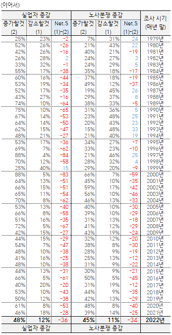 ¡Ý °ú°Å Çѱ¹ÀÎÀÇ °æ±â Àü¸Á ÃßÀ̸¦ º¸¸é, 1980³â´ë´Â ÁÖ·Î ³«°ü·ÐÀÌ ºñ°ü·ÐÀ» Å©°Ô ¾Õ¼¹À¸³ª 1990³â´ë´Â ³«°ü°ú ºñ°ü ¿ì¼¼°¡ ±³Â÷ È¥ÀçÇß°í 2000³â´ë µé¾î¼´Â ´ëü·Î ºñ°ü·ÐÀÌ ¿ì¼¼Çß´Ù. 1979³âºÎÅÍ 2022³â±îÁö 44³â°£ Á¶»ç Áß '»õÇØ °æ±â°¡ ÁÁ¾ÆÁú °Í'À̶õ ³«°ü·Ð ÃÖ°íÄ¡´Â 1983³âÀÇ 69%, ÃÖÀúÄ¡´Â ±¹Á¤³ó´Ü ÆÄ¹®ÀÌ °Å¼Ã´ø 2016³âÀÇ 4%´Ù.