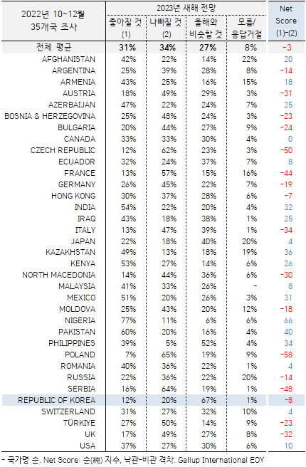 2022³â 10~12¿ù °¶·´ ÀÎÅͳ»¼Å³ÎÀÌ ¼¼°è 35°³±¹ ¼ºÀÎ 35,664¸í¿¡°Ô 2023³â »õÇØ Àü¸ÁÀ» ¹°Àº °á°ú 'ÁÁ¾ÆÁú °Í' 31%, '³ªºüÁú °Í' 34%, '¿ÃÇØ¿Í ºñ½ÁÇÒ °Í' 27%·Î ³«°ü·Ð°ú ºñ°ü·ÐÀÌ ºñµîÇØÁ³´Ù. 1³â Àü°ú ºñ±³ÇÏ¸é ³«°ü·ÐÀÌ 7%Æ÷ÀÎÆ® ÁÙ°í, ºñ°ü·ÐÀº 7%Æ÷ÀÎÆ® ´Ã¾ú´Ù.