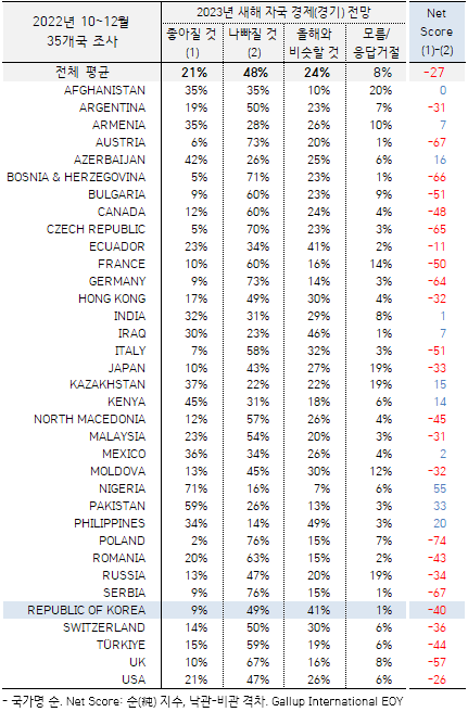 ¡Ý À̹ø Á¶»ç¿¡ Âü¿©ÇÑ 35°³ ³ª¶ó Áß 24°³±¹¿¡¼ »õÇØ ÀÚ±¹ °æÁ¦°¡ ¿ÃÇØº¸´Ù '³ªºüÁú °Í'À̶ó°í »ý°¢ÇÏ´Â »ç¶÷ÀÌ 'ÁÁ¾ÆÁú °Í'À̶õ »ç¶÷º¸´Ù 10%Æ÷ÀÎÆ® ÀÌ»ó ¸¹¾Ò´Ù. ƯÈ÷ Æú¶õµå¿Í ¼¼¸£ºñ¾Æ¿¡¼´Â »õÇØ ÀÚ±¹ °æ±â°¡ '³ªºüÁú °Í'À̶ó°í ´äÇÑ »ç¶÷ÀÌ °¢°¢ 76%·Î, °¡Àå Àü¸ÁÀÌ ¾îµÎ¿ü´Ù. ¿À½ºÆ®¸®¾Æ·µ¶ÀÏ(73%), º¸½º´Ï¾ÆÇ츣ü°íºñ³ª(71%), üÄÚ(70%), ¿µ±¹(67%) µî¿¡¼µµ ºñ°ü·ÐÀÌ 70% ¾ÈÆÆÀ̾ú´Ù.
