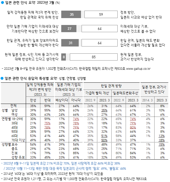 'ÇÑÀÏ °ü°è¿Í ±¹ÀÍ À§ÇØ Âù¼º' 35%, 'ÀϺ»ÀÇ »ç°ú¿Í ¹è»ó ¾ø¾î ¹Ý´ë' 59%