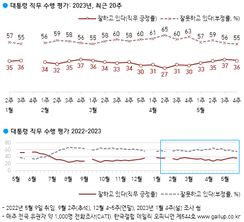 Çѱ¹°¶·´ÀÌ 2023³â 5¿ù ³Ý° ÁÖ(23~25ÀÏ) Àü±¹ ¸¸ 18¼¼ ÀÌ»ó 1,000¸í¿¡°Ô À±¼®¿ ´ëÅë·ÉÀÌ ÇöÀç ´ëÅë·ÉÀ¸·Î¼ÀÇ Á÷¹«¸¦ Àß ¼öÇàÇϰí ÀÖ´Ù°í º¸´ÂÁö À߸ø ¼öÇàÇϰí ÀÖ´Ù°í º¸´ÂÁö ¹°Àº °á°ú, 36%°¡ ±àÁ¤ Æò°¡Çß°í 55%´Â ºÎÁ¤ Æò°¡ÇßÀ¸¸ç ±× ¿Ü´Â ÀǰßÀ» À¯º¸Çß´Ù(¾î´À Âʵµ ¾Æ´Ô 3%, ¸ð¸§/ÀÀ´ä°ÅÀý 6%).