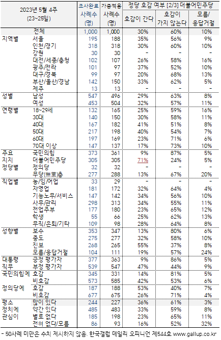 Çѱ¹°¶·´ÀÌ 2023³â 5¿ù 23~25ÀÏ Àü±¹ ¸¸ 18¼¼ ÀÌ»ó 1,000¸í¿¡°Ô 3°³ Á¤´çº° È£°¨ ¿©ºÎ¸¦ ¹°¾ú´Ù(¼ø¼ ·ÎÅ×À̼Ç). ±× °á°ú ±¹¹ÎÀÇÈû¿¡´Â 33%°¡ 'È£°¨ÀÌ °£´Ù'(ÀÌÇÏ 'È£°¨µµ'), 58%°¡ 'È£°¨ °¡Áö ¾Ê´Â´Ù'(ÀÌÇÏ 'ºñÈ£°¨µµ')°í ´äÇß°í, ´õºÒ¾î¹ÎÁÖ´ç¿¡ ´ëÇØ¼´Â ±× ºñÀ²ÀÌ 30%:60%, Á¤ÀÇ´çÀº 19%:67%·Î ³ªÅ¸³µ´Ù. 2¿ù ÃÊ¿Í ºñ±³ÇÏ¸é ¹ÎÁÖ´ç°ú Á¤ÀÇ´ç ºñÈ£°¨ÀÌ °¢°¢ 3%Æ÷ÀÎÆ® ´Ã¾ú°í, ±¹¹ÎÀÇÈûÀº º¯ÇÔ¾ø¾ú´Ù.