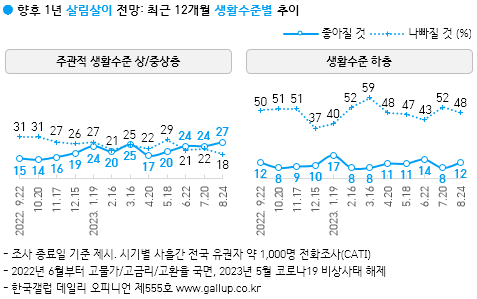 Çѱ¹°¶·´ÀÌ 2023³â 8¿ù 22~24ÀÏ Àü±¹ ¸¸ 18¼¼ ÀÌ»ó 1,000¸í¿¡°Ô ÇâÈÄ 1³â°£ ¿ì¸®³ª¶ó °æ±â Àü¸ÁÀ» ¹°Àº °á°ú 55%°¡ '³ªºüÁú °Í'À̶ó°í ³»´ÙºÃ°í, 18%¸¸ 'ÁÁ¾ÆÁú °Í', 24%´Â 'ºñ½ÁÇÒ °Í'À̶ó°í ´äÇß´Ù. 4%´Â ÀǰßÀ» À¯º¸Çß´Ù. °æ±â ³«°ü·ÐÀº ÀÛ³â 1¿ù 30%¿¡¼ ÇϹݱâ 10%´ë ÃʹÝÀ¸·Î ÁÙ¾ú°í, °°Àº ±â°£ ºñ°ü·ÐÀº 29%¿¡¼ ÃÖ°í 66%(10¿ù)±îÁö ´Ã¾ú´Ù. À̹ø ´Þ °æ±â Àü¸ÁÀº Áö³´Þ°ú ºñ½ÁÇϸç, »ì¸²»ìÀÌ¿Í ±¹Á¦°ü°è Àü¸Áµµ ¸¶Âù°¡Áö´Ù.