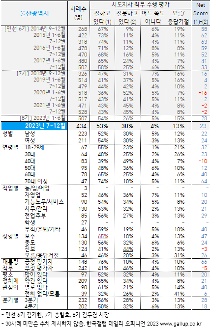 ±èµÎ°â(±¹¹ÎÀÇÈû) ¿ï»ê½ÃÀåÀº ¿ï»ê ³²±¸ »ï¼± ±âÃÊÀÇ¿ø(¹Î¼± 1~3±â), Àç¼± ±¸Ã»Àå(4·5±â)À» °ÅÃÄ 2022³â ½ÃÀåÀÌ µÆ´Ù. 2023³â ÇϹݱâ Á÷¹« ±àÁ¤·üÀº 53%, ºÎÁ¤·üÀº 30%´Ù. 40´ë¸¦ Á¦¿ÜÇÑ ´ëºÎºÐÀÇ ÀÀ´äÀÚ Æ¯¼º¿¡¼ 'ÀßÇϰí ÀÖ´Ù'´Â ½Ã°¢ÀÌ ¿ì¼¼Çϰųª ±à·ºÎÁ¤ Æò°¡°¡ ºñ½ÁÇÏ°Ô °¥·È´Ù. Á÷¹« Æò°¡ ¼øÁö¼ö ±âÁØÀ¸·Î º¸¸é 60´ë(40)¿Í 70´ë ÀÌ»ó(64), ¼ºÇâ º¸¼öÃþ(47)¿¡¼ ³ô°í, 40´ë(-10)¿¡¼ °¡Àå ³·´Ù.