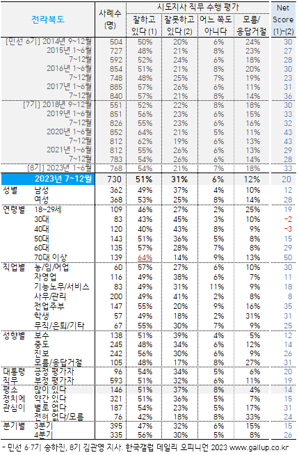 | ±¤¿ªÀÚÄ¡´ÜüÀå Á÷¹« ¼öÇà Æò°¡ ÀÚ·á °ø°³¿¡ ¾Õ¼ Çѱ¹°¶·´Àº 2012³â 1¿ùºÎÅÍ ´ëÅë·É Á÷¹« ¼öÇà Æò°¡¿Í µ¿ÀÏ Áú¹®, µ¿ÀÏ Á¶»ç ¹æ¹ýÀ¸·Î ±¤¿ªÀÚÄ¡´ÜüÀå Á÷¹« ¼öÇà Æò°¡µµ º´ÇàÇϰí ÀÖ½À´Ï´Ù. ¹«¼±ÀüÈ °¡»ó¹øÈ£ Ç¥º» ÇÁ·¹ÀÓ¿¡¼ Àü±¹ Àα¸ ºñ·Ê¿¡ ¸ÂÃç Á¶»ç´ë»óÀÚ¸¦ ¼±Á¤ÇϹǷÎ, ½Ãµµº° Àα¸ ¼ö¿¡ µû¶ó Ç¥º» ±Ô¸ð Â÷À̰¡ Å®´Ï´Ù. 2023³â ÇϹݱâ Á¶»ç¿¡¼ °æ±âµµ¹ÎÀº 5,500¸í ÀÎÅͺäÇßÀ¸³ª, ¼¼Á¾½Ã¹ÎÀº 200¸íÀ» ¹Øµ¹¾Æ ÀÌ Áö¿ªÀÇ ¼öÄ¡´Â Á¦½ÃÇÏÁö ¾Ê½À´Ï´Ù. ¡Ý Âü°í·Î, Ç¥º»Å©±âº° Ç¥º»¿ÀÂ÷(95% ½Å·Ú¼öÁØ)´Â ´ÙÀ½°ú °°½À´Ï´Ù. 50¸í/±13.9%P(Æ÷ÀÎÆ®), 100¸í/±9.8%P, 300¸í/±5.7%P, 500¸í/±4.4%P, 800¸í/±3.5%P, 1,000¸í/±3.1%P, 1,500¸í/±2.5%P, 3,000¸í/±1.8%P, 4,000¸í/±1.5%P, 5,000¸í/±1.4%P ¡Ý 2022³â 6¿ù Áö¹æ¼±°Å¿¡¼ ´ç¼±ÇÑ ¹Î¼± 8±â ÇöÁ÷ ½ÃµµÁö»çÀÇ 2023³â ÇϹݱâ Á÷¹« Æò°¡´Â ÇØ´ç ½Ãµµ¹Î Ư¼ºº°·Î ¾î¶»°Ô ´Ù¸¥Áö º¼ ¼ö ÀÖÀ¸¸ç, ¹Î¼± 6~7±â(2014~2021³â)¿Íµµ ºñ±³ÇÒ ¼ö ÀÖ½À´Ï´Ù. ¶ÇÇÑ ½Ãµµº° ¼º/¿¬·É/Á÷¾÷/»ýȰ¼öÁØ/¼ºÇâ ±¸¼ººñ, Áï ÀÀ´äÀÚ Æ¯¼ºÇ¥¸¦ ÇÔ²² Á¦½ÃÇß½À´Ï´Ù. ¡Ý 2012³â ÀÌÈÄ ½ÃµµÁö»ç Á÷¹« ¼öÇà Æò°¡ °á°ú → ¹Î¼± 8±â 2023³â »ó¹Ý±â → ¹Î¼± 7±â 2018³â 9~12¿ù | 2019³â »ó · ÇϹݱâ | 2020³â »ó · ÇϹݱâ | 2021³â »ó · ÇϹݱâ → ¹Î¼± 6±â 2014³â 9~12¿ù | 2015³â »ó · ÇϹݱâ | 2016³â »ó · ÇϹݱâ | 2017³â »ó · ÇϹݱâ → ¹Î¼± 5±â 2012³â 1¿ù~2013³â 9¿ù |