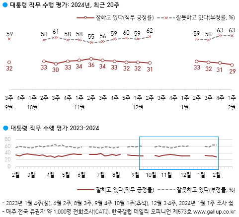 Çѱ¹°¶·´ÀÌ 2024³â 2¿ù ù° ÁÖ(1/30-2/1) Àü±¹ ¸¸ 18¼¼ ÀÌ»ó À¯±ÇÀÚ 1,000¸í¿¡°Ô À±¼®¿ ´ëÅë·ÉÀÌ ÇöÀç ´ëÅë·ÉÀ¸·Î¼ÀÇ Á÷¹«¸¦ Àß ¼öÇàÇϰí ÀÖ´Ù°í º¸´ÂÁö À߸ø ¼öÇàÇϰí ÀÖ´Ù°í º¸´ÂÁö ¹°Àº °á°ú, 29%°¡ ±àÁ¤ Æò°¡Çß°í 63%´Â ºÎÁ¤ Æò°¡ÇßÀ¸¸ç ±× ¿Ü´Â ÀǰßÀ» À¯º¸Çß´Ù(¾î´À Âʵµ ¾Æ´Ô 3%, ¸ð¸§/ÀÀ´ä°ÅÀý 5%).
