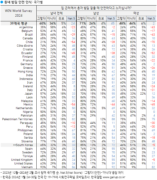 ³¡À¸·Î, Áý ±Ùó¿¡¼ È¥ÀÚ ¹ã±æÀ» °ÉÀ» ¶§ ¾ÈÀüÇÏ´Ù°í ´À³¢´ÂÁö ¹°¾ú´Ù. ±× °á°ú 39°³±¹ ¼ºÀÎ Áß 60%°¡ '±×·¸´Ù'¶ó°í ´äÇß°í, ³²¼º(71%)ÀÇ ±àÁ¤·üÀÌ ¿©¼º(48%)º¸´Ù ´õ ³ô¾Ò´Ù. Çѱ¹ÀÎ Áß¿¡¼´Â 65%°¡ µ¿³× ¹ã±æÀÌ ¾ÈÀüÇÏ´Ù°í ºÃÀ¸³ª, 20·30´ë ¿©¼º ¼Â Áß µÑÀº ±×·¸Áö ¸øÇÑ °ÍÀ¸·Î ³ªÅ¸³µ´Ù.