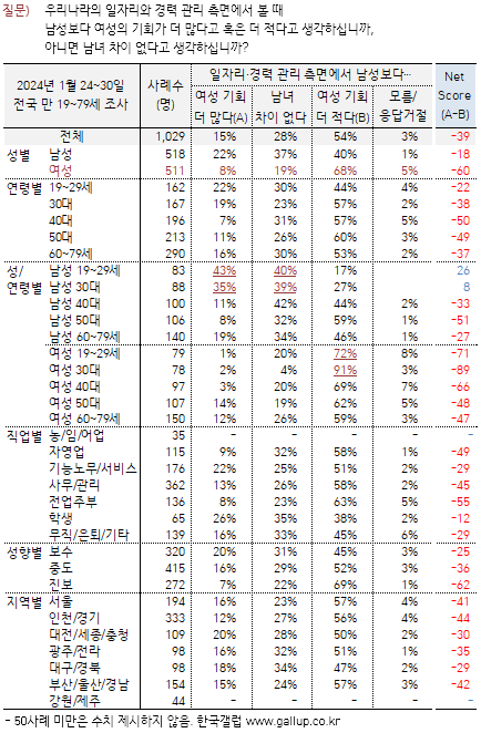 ¡Ý ¼ºº°·Î º¸¸é ³²¼º Áß 34%°¡ '¿©¼ºÀÇ ÀÏÀÚ¸®·°æ·Â ±âȸ°¡ ´õ Àû´Ù'°í º¸¸ç, ¿©¼º¿¡°Ô¼´Â ±× ºñÀ²ÀÌ 54%¿¡ ´ÞÇÑ´Ù. '³²³à Â÷ÀÌ ¾ø´Ù'´Â ÀÀ´äÀº ³²¼º(45%)¿¡¼ ¿©¼º(33%)À» ¾Õ¼°í, '¿©¼ºÀÇ ±âȸ°¡ ´õ ¸¹´Ù'°í ´À³¢´Â »ç¶÷Àº ³²¼º 17%, ¿©¼º 9%´Ù. Áï, ÀÏÀÚ¸®·°æ·Â ±âȸ Ãø¸é¿¡¼ °¢±¹ ¿©¼ºÀÌ ³²¼ºº¸´Ù ºÒ¸®ÇÔÀ» ´À³¤´Ù°í º¼ ¼ö ÀÖ´Ù.