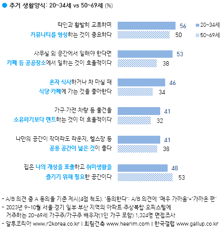 ¡Ý ÀÌ Á¶»ç´Â ºÎµ¿»ê Æ®·»µå ÆÄ¾ÇÀ» À§ÇÑ °ÍÀ̹ǷÎ, ¹Ì·¡ ½Å±Ô ÁÖÅà ¼ö¿äÀÚÀÎ 20~34¼¼¸¦ Áß½ÉÀ¸·Î ±×µéÀÇ ºÎ¸ð ¼¼´ëÀÎ 50·60´ë¿Í ºñ±³ÇÏ¸é ´ÙÀ½°ú °°´Ù: '»ç¹«½Ç ¿Ü °ø°£¿¡¼ ÀÏÇÑ´Ù¸é Ä«Æä µî °ø°øÀå¼Ò¿¡¼ ÀÏÇÏ´Â °ÍÀÌ È¿À²ÀûÀÌ´Ù' 53%(vs 38%), 'È¥ÀÚ ½Ä»çÇϰųª Â÷ ¸¶½Ç ¶§ ½Ä´ç·Ä«Æä¿¡ °¡´Â °ÍÀ» ÁÁ¾ÆÇÑ´Ù' 46%(vs 34%), '¹°°ÇÀ» ¼ÒÀ¯Çϱ⺸´Ù ·»Æ®ÇÏ´Â °ÍÀÌ ´õ È¿À²ÀûÀÌ´Ù' 41%(vs 32%).