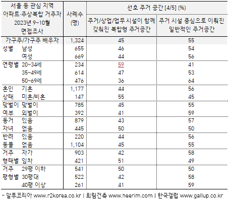 ¡Ý À¯Çüº° ÁÖ°Å °ø°£ ¼±È£ °æÇâÀº ´ëºÎºÐ ¾ùºñ½ÁÇÏ°Ô ³ª´µ¾úÀ¸³ª, Ç® ¿É¼Ç¿¡ ºñ½Ñ ÀÓ´ë·á¸¦ ÁöºÒÇϱ⺸´Ù ¿É¼Ç ¾øÀÌ ÀÓ´ë·á Àú·ÅÇÑ ÁýÀ» ¿øÇÏ´Â »ç¶÷ÀÌ Á» ´õ ¸¹¾Ò´Ù. ¿¬·Éº°·Î º¸¸é 20~34¼¼´Â ºÎ´ë ÆíÀÇ ½Ã¼³·¼ºñ½º¸¦ °®Ãá ¿ª¼¼±Ç º¹ÇÕÇü ÁְŰø°£À», 50·60´ë´Â »ó´ëÀûÀ¸·Î ÁÖÅð¡ÀÇ ÀϹÝÀûÀÎ ÁְŰø°£À» ¼±ÅÃÇß´Ù.