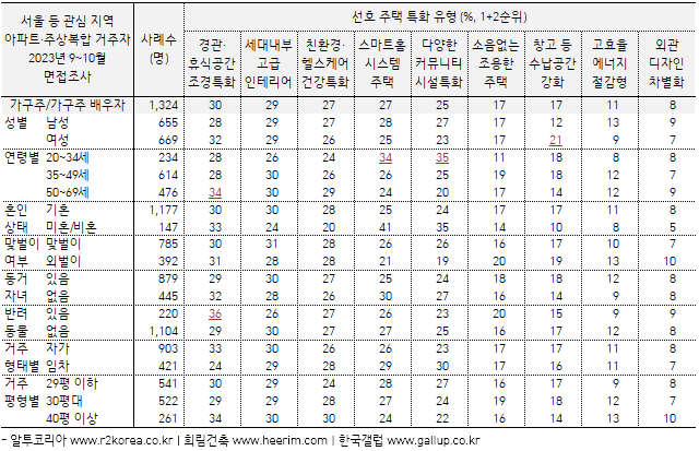 ¡Ý ÀÀ´äÀÚ Æ¯¼ºº°·Î º¸¸é 'Á¶°æ ƯÈ'´Â 50·60´ë¿Í µ¿¹°¹Ý·ÁÀο¡°Ô¼ ÃÖ¿ì¼±½ÃµÆ°í, '½º¸¶Æ® ÁÖÅÃ'°ú 'Ä¿¹Â´ÏƼ ½Ã¼³ ƯÈ'´Â 20~34¼¼¿¡°Ô¼ µÎµå·¯Á³´Ù. Àü³âµµ¿Í ºñ±³Çϸé 'Á¶°æ'(2022³â 25% → 2023³â 30%)°ú '°í±Þ ÀÎÅ׸®¾î'(23%→29%) Æ¯È À¯Çü ¼±È£°¡ 5~6%Æ÷ÀÎÆ® ´Ã¾ú°í, '½º¸¶Æ® ƯÈ'(40%→27%)´Â Å©°Ô ÁÙ¾ú´Ù. ÇѶ§ ´«±æÀ» ²ö ½ÅÃà ¾ÆÆÄÆ®ÀÇ °¢Á¾ ÷´Ü Á¦¾î ½Ã½ºÅÛÀº ½Ã°£ÀÌ °¡¸é ÁøºÎÇØÁöÁö¸¸, Àß °ü¸®µÈ ¼ö¸ñ·°ø¿ø µî °æ°ü, Ãß°¡·Î ¼Õ´î ÇÊ¿ä ¾øÀÌ °í±ÞÈÇÑ ÀÎÅ׸®¾î´Â ½Ç»ýȰ ¸¸Á·µµ¸¦ ³ôÀÌ´Â ¿ä¼Ò·Î ÀÛ¿ëÇϸ®¶ó ÁüÀ۵ȴÙ.