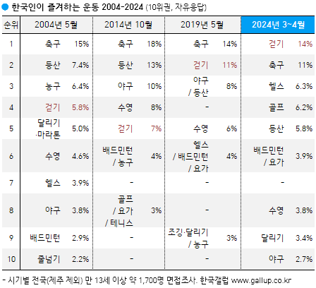 Á÷Á¢ ÇÏ´Â ¿îµ¿/½ºÆ÷Ã÷ Áß¿¡¼ °¡Àå Áñ°ÜÇÏ´Â ¿îµ¿(ÀÚÀ¯ÀÀ´ä)À¸·Î´Â '°È±â'(14%), 'Ã౸'(11%), 'Çコ'(6.3%), '°ñÇÁ'(6.2%), 'µî»ê'(5.8%), '¹èµå¹ÎÅÏ', '¿ä°¡'(ÀÌ»ó 3.9%), '¼ö¿µ'(3.8%), '´Þ¸®±â'(3.4%), '¾ß±¸'(2.7%) ¼øÀ¸·Î ³ªÅ¸³µ´Ù.
