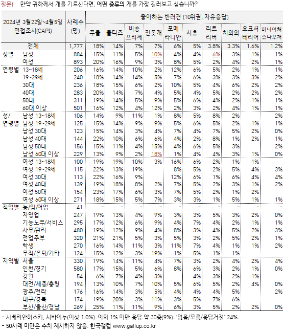 ¡Ý 2024³â ÇöÀç Çѱ¹ÀÎÀÌ °¡Àå ÇÔ²²ÇÏ°í ½Í¾î ÇÏ´Â ¹Ý·Áµ¿¹°(ÀÚÀ¯ÀÀ´ä)Àº '°³'(62%)°¡ 1À§·Î, 2À§ '°í¾çÀÌ'(12%)¸¦ Å©°Ô ¾Õ¼¹´Ù. ±×´ÙÀ½À¸·Î´Â '»õ'(2%), '¹°°í±â'(0.6%), 'ÇܽºÅÍ', '°ÅºÏÀÌ'(ÀÌ»ó 0.2%) µîÀÌ ¾ð±ÞµÆ´Ù. ÁÁ¾ÆÇÏ´Â ¹Ý·Áµ¿¹°ÀÌ ¾ø´Ù´Â ÀÀ´äÀº 22%·Î, °í¿¬·ÉÀϼö·Ï ¸¹´Ù(10·20´ë 10% ÀÌÇÏ; 60´ë+ 33%).