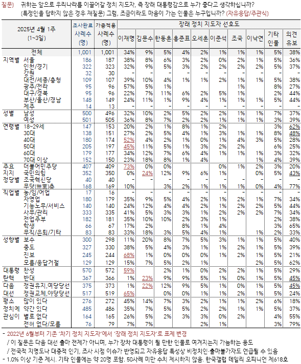 Çѱ¹°¶·´ÀÌ 2025³â 4¿ù 1~3ÀÏ Àü±¹ À¯±ÇÀÚ 1,001¸í¿¡°Ô ¾ÕÀ¸·Î ¿ì¸®³ª¶ó¸¦ À̲ø¾î°¥ Á¤Ä¡ ÁöµµÀÚ, Áï Àå·¡ ´ëÅë·É°¨À¸·Î ´©°¡ ÁÁ´Ù°í »ý°¢ÇÏ´ÂÁö ¹°Àº °á°ú(ÀÚÀ¯ÀÀ´ä), ÀÌÀç¸í ´õºÒ¾î¹ÎÁÖ´ç ´ëÇ¥ 34%, ±è¹®¼ö °í¿ë³ëµ¿ºÎ Àå°ü 9%, Çѵ¿ÈÆ Àü ±¹¹ÎÀÇÈû ´ëÇ¥ 5%, È«ÁØÇ¥ ´ë±¸½ÃÀå 4%, ¿À¼¼ÈÆ ¼¿ï½ÃÀå 2%, ÀÌÁؼ® °³Çõ½Å´ç ÀÇ¿ø, Á¶±¹ Àü Á¶±¹Çõ½Å´ç ´ëÇ¥, À̳«¿¬ Àü ±¹¹«ÃѸ® °¢°¢ 1% ¼øÀ¸·Î ³ªÅ¸³µ´Ù. 5%´Â ÀÌ¿Ü Àι°(1.0% ¹Ì¸¸ ¾à 20¸í Æ÷ÇÔ), 38%´Â ƯÁ¤ÀÎÀ» ´äÇÏÁö ¾Ê¾Ò´Ù.