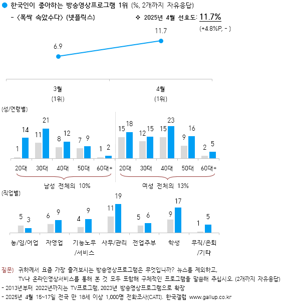 Çѱ¹°¶·´ÀÌ 2025³â 4¿ù 15~17ÀÏ Àü±¹ ¸¸ 18¼¼ ÀÌ»ó 1,000¸í¿¡°Ô ¿äÁò °¡Àå Áñ°Üº¸´Â ¹æ¼Û¿µ»óÇÁ·Î±×·¥À» ¹°Àº °á°ú(2°³±îÁö ÀÚÀ¯ÀÀ´ä), ³ÝÇø¯½º À¥µå¶ó¸¶ ¡´Æø½Ï ¼Ó¾Ò¼ö´Ù¡µ°¡ ¼±È£µµ 11.7%·Î µÎ ´Þ ¿¬¼Ó 1À§¸¦ Â÷ÁöÇß´Ù.