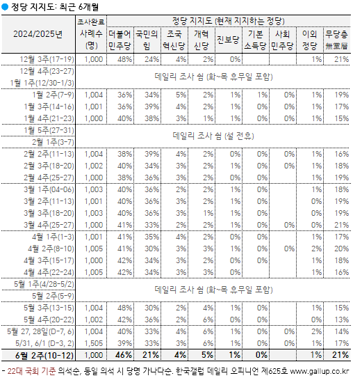 2025³â 6¿ù µÑ° ÁÖ(10~12ÀÏ) ÇöÀç ÁöÁöÇÏ´Â Á¤´çÀº(´ç¸í ·ÎÅ×À̼Ç, ÀçÁú¹® 1ȸ) ´õºÒ¾î¹ÎÁÖ´ç 46%, ±¹¹ÎÀÇÈû 21%, °³Çõ½Å´ç 5%, Á¶±¹Çõ½Å´ç 4%, Áøº¸´ç 1%, ÀÌ¿Ü Á¤´ç/´Üü 1%, ÁöÁöÇÏ´Â Á¤´ç ¾ø´Â ¹«´ç(ÙíÓÚ)Ãþ 21%·Î ³ªÅ¸³µ´Ù.