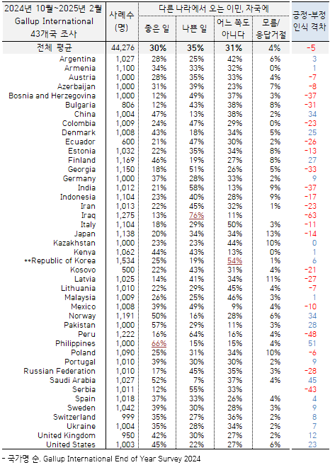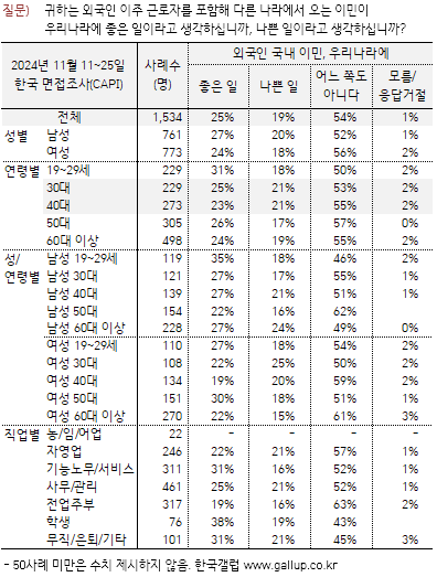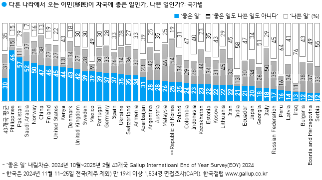 2024³â 10¿ùºÎÅÍ 2025³â 2¿ù±îÁö °¶·´ ÀÎÅͳ»¼Å³ÎÀÌ 43°³±¹ ¼ºÀÎ 44,276¸í¿¡°Ô ¿Ü±¹ÀÎ ÀÌÁÖ ±Ù·ÎÀÚ¸¦ Æ÷ÇÔÇØ ´Ù¸¥ ³ª¶ó¿¡¼ ¿À´Â À̹ÎÀÌ ÀÚ±¹¿¡ ÁÁÀº ÀÏÀ̶ó°í »ý°¢ÇÏ´ÂÁö, ³ª»Û ÀÏÀ̶ó°í »ý°¢ÇÏ´ÂÁö ¹°¾ú´Ù. ±× °á°ú 30%´Â ÀÚ±¹¿¡ 'ÁÁÀº ÀÏ', 35%´Â '³ª»Û ÀÏ', 31%´Â ¾î´À Âʵµ ¾Æ´Ï¶ó°í(ÀÌÇÏ 'Á߸³') ´äÇß´Ù. 4%´Â ÀǰßÀ» À¯º¸Çß´Ù.
