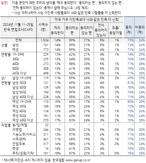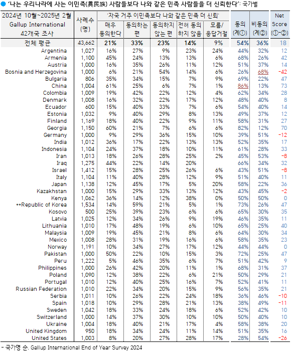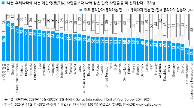 ´ÙÀ½À¸·Î 42°³±¹ ½Ã¹Î¿¡°Ô 'ÀÚ±¹ °ÅÁÖ À̹ÎÁ· »ç¶÷µéº¸´Ù ÀڽŰú °°Àº ¹ÎÁ· »ç¶÷µéÀ» ´õ ½Å·ÚÇÑ´Ù'¶ó´Â ¹®Àå¿¡ ´ëÇÑ µ¿ÀÇ ¿©ºÎ¸¦ ¹°¾ú´Ù(4Á¡ ôµµ). ±× °á°ú 54%°¡ µ¿ÀÇÇß°í, 36%´Â µ¿ÀÇÇÏÁö ¾Ê¾Ò´Ù('¸Å¿ì µ¿ÀÇ' 21%, 'µ¿ÀÇÇÏ´Â Æí' 33%, 'µ¿ÀÇÇÏÁö ¾Ê´Â Æí' 23%, 'ÀüÇô µ¿ÀÇÇÏÁö ¾Ê´Â´Ù' 14%). 9%´Â ÀǰßÀ» À¯º¸Çß´Ù.