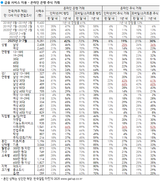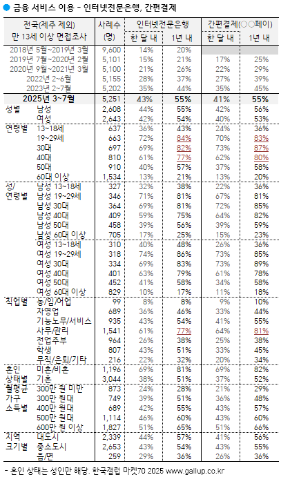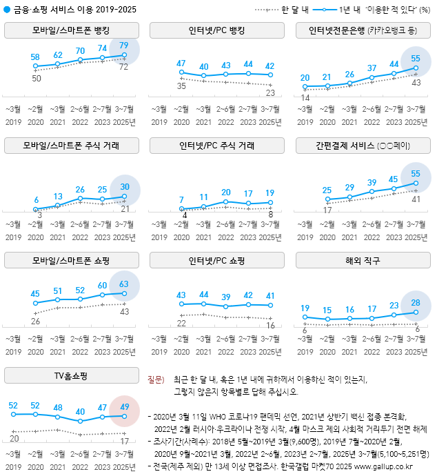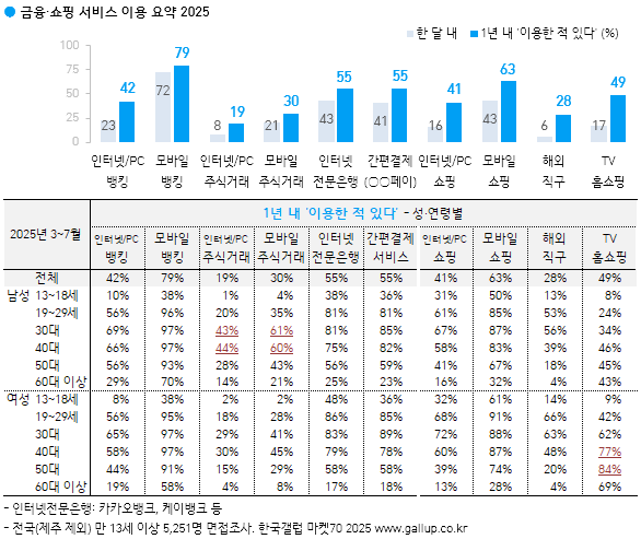 Çѱ¹°¶·´ÀÌ 2025³â 3¿ùºÎÅÍ 7¿ù±îÁö Àü±¹(Á¦ÁÖ Á¦¿Ü) ¸¸ 13¼¼ ÀÌ»ó 5,251¸í¿¡°Ô ±ÝÀ¶, ¼îÇÎ, »ýȰÆíÀÇ, ¹Ì¿ë °ü·Ã ¼ºñ½º 19Á¾ °¢°¢¿¡ ´ëÇÑ ÀÌ¿ë °æÇèÀ» ¹°¾ú´Ù. ¿ì¼± ±ÝÀ¶ °ü·Ã ¼ºñ½ºº° ÃÖ±Ù 1³â ³» ÀÌ¿ë °æÇèÀÚ ºñÀ²(ÀÌÇÏ '¿¬°£ ÀÌ¿ë·ü')ºÎÅÍ º¸¸é ¸ð¹ÙÀÏ/½º¸¶Æ®Æù(ÀÌÇÏ '¸ð¹ÙÀÏ') ¹ðÅ·ÀÌ 79%·Î ÀÎÅͳÝ/PC(ÀÌÇÏ 'PC') ¹ðÅ·(42%)À» Å©°Ô ¾Õ¼¹°í, °£Æí°áÁ¦(¡Û¡ÛÆäÀÌ)¿Í ÀÎÅͳÝÀü¹®ÀºÇà(īī¿À¹ðÅ©, ÄÉÀ̹ðÅ© µî) °¢°¢ 55%, ¸ð¹ÙÀÏ ÁÖ½Ä °Å·¡ 30%, PC ÁÖ½Ä °Å·¡ 19% ¼øÀ¸·Î ³ªÅ¸³µ´Ù. ÁÖ¿ä ¼îÇΠä³Îº° ¿¬°£ ÀÌ¿ë·üÀº ¸ð¹ÙÀÏ ¼îÇÎ 63%, TVȨ¼îÇÎ 49%, PC ¼îÇÎ 41%, ÇØ¿Ü Á÷±¸ 28%´Ù.